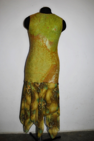 Еще один эксперимент, платье "Русалка", тоже по МК из интернета, и тоже прежде чем понравилось сделала несколько экземпляров. Первый был как в МК на марле, мне не понравилось, марля она и есть марля, фактуры конечно интересные дает, но взрослой женщине в таком не комильфо, да и цепляется за все. На юбку потратить много дорогого шелка не решилась (у меня его есть кое что, но я над ним как Кощей над златом), Поэтому 2 экземпляр должен плавно перейти в маечку, это пока в недоделках. К 3 экземпляру уже появилась концепция, не знаю насколько это читаемо, но я считаю что это древо познания. Пока валяла, в голове крутились стихи, кажется И. Сельвинского.