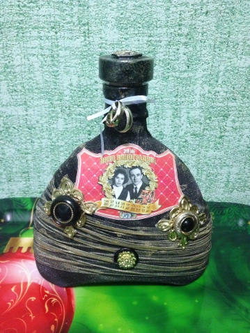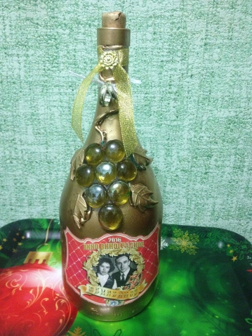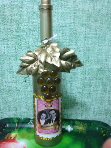 Долго наблюдаю за работами других. Вот решила выставить свои работы. Оформила серию бутылок к золотой свадьбе родителей. Дело в том, что мой папа выращивает роскошный виноград, а мама делает из него прекрасное вино. На свадьбе гостям всегда предлагают вино,оно вкуснейшее, но из пластиковых бутылок наливать на свадьбе как-то не комильфо. Вот я и решила попробовать - получилось вроде бы неплохо. Они все разные. Не судите строго - это мой первый опыт.