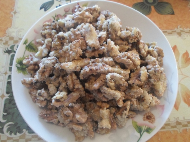 Можно, конечно, обдать ядра орехов кипятком и почистить, но не надо, ведь вместе с кожицей потеряются и полезные вещества, которых там много. Ведь именно эта кожурка на ядрах ореха содержит уйму полезных веществ. А чтоб сделать вкус орехов более привлекательным, я прокаливаю орехи на сковороде, сбрызгиваю водой, посыпаю сахаром с добавлением ванили, и на медленном огне довожу до сухого состояния. Сахар прилипает к орехам, получаются орехи в сахаре. Вот такие орехи дети лопают за обе щеки))))
