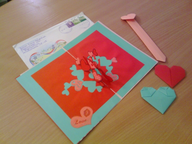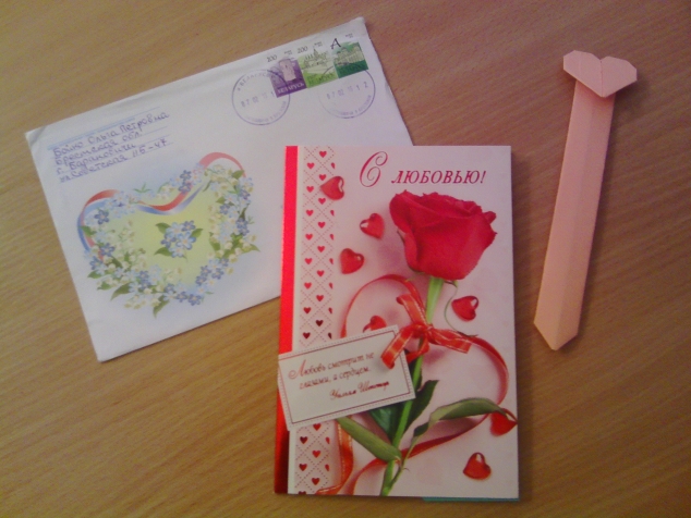 А прислала мне его Бойко Ольга из Барановичей, соседка по Республике.Отрытку внутри сама делала, закладки -сердечко бумажные для книг и присьмо с тёплыми словами пожеланий.Спасибо огромное за внимание и желание делать добро..