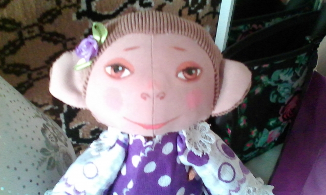 У тыквоголовки голову нужно кроить по косой, иначе сделав набивку получим бугорки, как у моей обезьянки. Обратите внимание в районе подбородка по шву, у сиреневой обезьянки -пример как не надо делать,)) А если быть более точной, то не просто по косой, а под углом 45 градусов. Тогда набивка головы будет равномерной, без перекосов и бугров .)