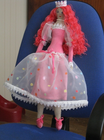 Моя Настюша попросила пошить куколку в розовом платье и чтобы была похожа на принцессу,я шила,а она сидела рядом и подсказывала,что она хочет,вот что получилась,какой то гибрид тильды и куклы,зато Настюня довольна,да еще и пожелала,чтобы я разместила ее фото с куколкой