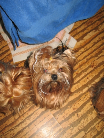 Вчера сплела из веточек каркас, с утра покрыла его белой водоэмульсионкой и радостно пошла делать гимнастику. Закончив, захожу на кухню и вижу, что весь мой любимый пробковый пол в изящных белых "кружевах"))) Красиво, конечно! Но я не заказывала такой дизайн! Да и не поняла, сначала - откуда такое!!! Пока не бросила взгляд на своих йорочек!!! Мамадарагая!!! У Тиши вся мордочка белая!!! Испугалась, что засохла и не смоется - побежала отмывать свою крошку Ван-Гога!!! Но всё отмылось! Только справилась с Тишей, смотрю, а у Лиззи тоже мордочка с мелированием! ))) Ну, тут я взяла фотик в руки и запечатлела Крошку-Гогена))) А потом уж отмыла!))) Собаки были недовольны: мало того, что морды вымыли, так ещё и пол мамка отдраила! Весь утренний труд - насмарку!!!