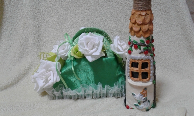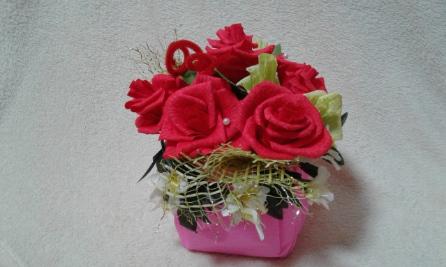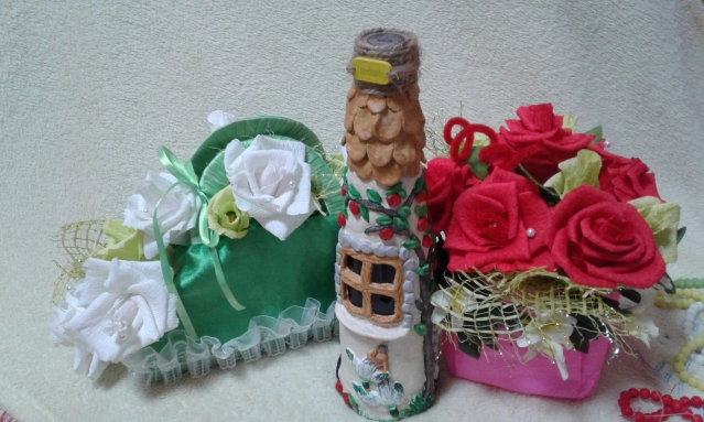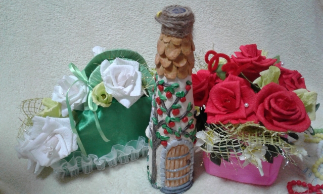 пока высыхал декор на бутылке,то создались вот такие "букеты" из конфет и гофробумаги...