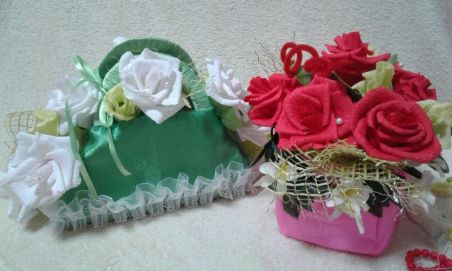 один "букет" сделан в виде дамской сумочки с россыпью роз.