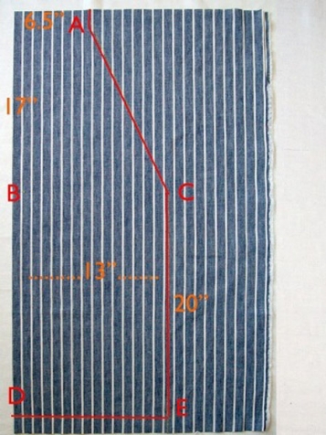 3.Выкройка почти получилась. От точки В вниз отмерьте пятьдесят сантиметров. И от точки С сделайте такую же отметку вниз. Теперь возьмите мелок и соедините эти пять то-чек. В итоге у вас получится рисунок, похожий на домик. Это и будет наша выкройка.