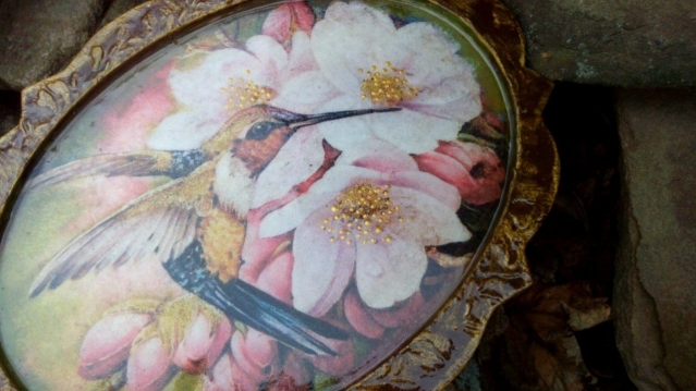 Хотелось,чтобы его миниатюрность и изящность как-то подчеркивалась декором. Выбор пал на колибри, из нескольких принтов (я их выложила в топике "По просьбам трудящихся"), выбрала наиболее мне симпатичный))) Остальные с удовольствием использовали мои ученицы))) Итак, по исполнению - распечатка на рисовой бумаге, дорисовка, золотой глиттер, золотой контур, объем шпатлевкой тонирован золотом в технике, "сухая кисть".