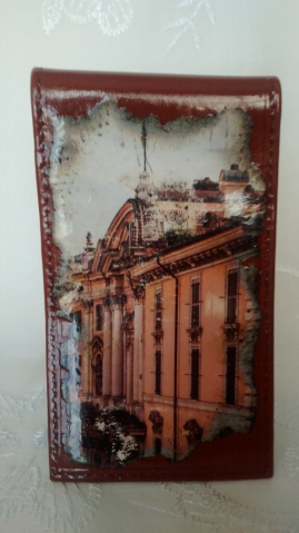 Я сначала покрыла матовым лаком картинку на коже, показала дочке (для неё сделала, т.к. купила ей кошелёк такого же цвета, хотела в придачу и для визиток или карточек что-то сделать), она сказала, мол сделай что-нибудь с ней, чтобы смотрелось новой, а не как после пожара какое-то старьё :).