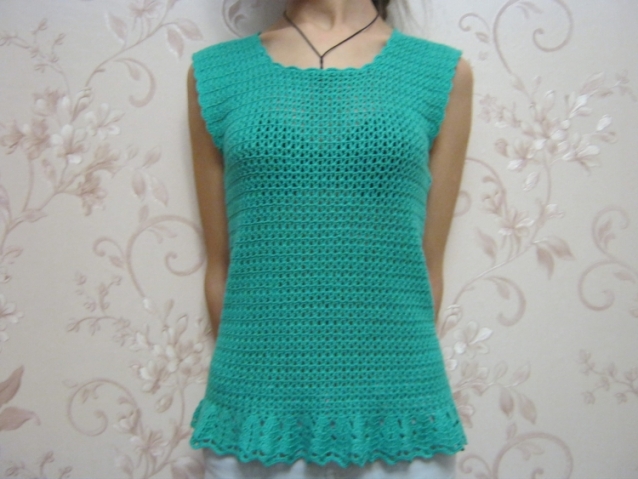 Связала дочке топик из ниточек АЛИЗЕ бамбук 50%, хлопок 50%. Было 4 моточка по 50 г. Вязала крючком №2. На 42-ой размер ушло всё. Кайму пришлось оставить недовязанной.