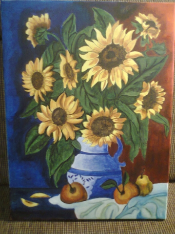 Хочу поделиться с Вами своей работой. Моя внимательная и наблюдательная подруга всегда угадывает, что мне подарить для души. Зная, что я обожаю подсолнухи и люблю рисовать, она подарила мне набор (холст с нанесенным контуром и с маленькой картинкой-подсказкой, краски и кисти).