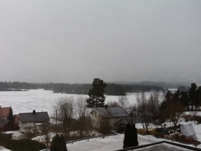 У нас зимние каникулы. Посылаю фото из номера гостиницы: белое поле — это замороженное озеро, а выше горизонта — высооокие горы, их не видно.