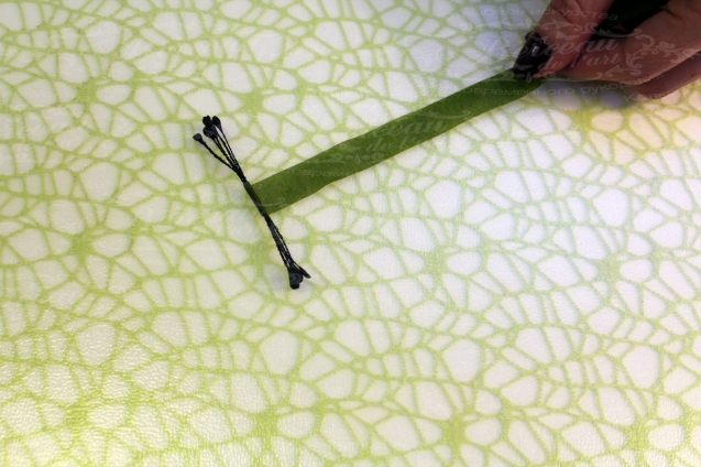 5. От верхушки ствола отрезаем 1 см, двусторонние тычинки с помощью тейп-ленты соединяем посредине (количество тычинок берем по своему усмотрению), разрезаем пополам и с помощью клея и тейп-ленты закрепляем их к стволу со стороны среза с двух сторон.