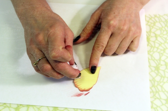 4. Для того, чтобы замоделировать лист тюльпана, каждый лист прогреваем на молде под тонкой салфеткой или пергаментной бумагой. После чего стараемся всей ладонью охватить весь лепесток, а затем пальцами прорабатываем все участки листа.
