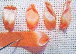 Скрутила ленточку и вывела её на изнаночную сторону,образуя жгутик-стебелёк.