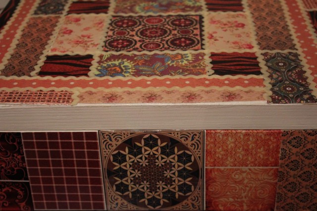 Ну а дальше все понятно. Все соединения прячем за тесьмой, покрываем лаком. Красим в тон боковушки крышки и дно шкатулки. Ручку сделала из полимерной глины. Внутри пока загрунтовала белой краской- еще не придумала, как ее отделать.