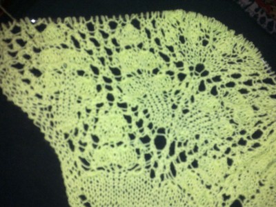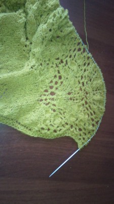 Связала тело и 9 рядов. Сегодня распечатаю схемы и вперед… На фото — тело шали и первый ряд с маркерами между раппортами.
