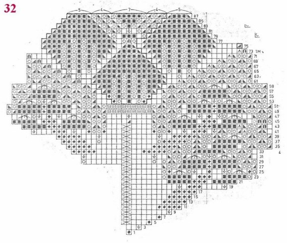 Просто нужно понять рисунок, сначало из 9 петель вывязали 3 листика, а начниная с 45 ряда вывязываются 4 новых листика, а с 59 ряда будут вывязываться веерочки(3 шт.) между верхини 4-мя листиками.
