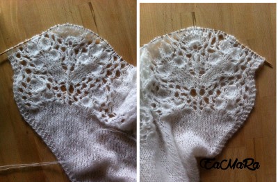 Тело вязала до 168 петель, это вместе с кромочными. Разделила на 8 раппортов. Ажур вязала с 27 ряда по схеме салфетки. Первый и последний раппорт без перекрученной веточки около кромочных. Потом в 29 ряду по схеме салфетки после и до кромочных добавила петлю из протяжки для вывязывания больших листиков. Далее по схеме. В конце вязания листики продолжила до 91 ряда, и в 92-м изнаночном ряду закрыла эластичным способом, с накидом который. Мне как-то не очень нравится закрытие как в салфетках.