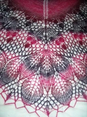 Девочки, сначала собиралась вязать шаль одной дальней родственнице в подарок. У той юбилей осенью. Ну не вяжется шаль и всё. Даже тело гладью не могу, ряд провяжу и откладываю в сторону. Но как-то осилила половину каймы. Тут моя мама рассмотрела то, что получается и фото готовой, и я вижу, что ей нравится (а до этого отказывалась от любой шали). Говорю — мам, буду тебе эту шаль вязать, а тёте до осени еще успею связать. И что вы думаете? связалось на одном дыхании! )) странно так ))