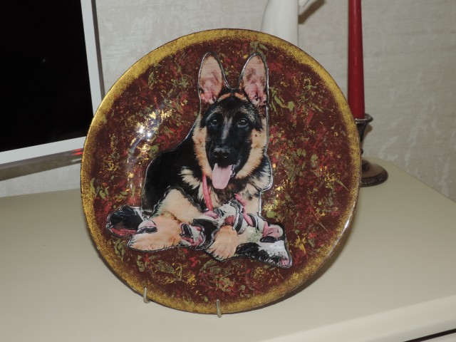 Дочь привезла щенка из Италии. Его первый портрет в России и моя первая тарелочка в декупаже. Подарок дочери по Мк Наташи Фохтиной. Правда без полосочек, но по-моему к нашему маленькому они не подошли бы.