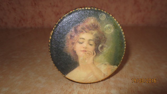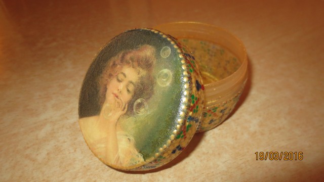 Из коробки получилась интересная шкатулка, а вот у баночки такая изящная романтичная крышка и совсем не подходящие к ней по цвету боковинки. Отдельно все смотрится хорошо, но вместе они не играют.