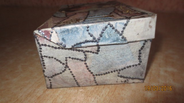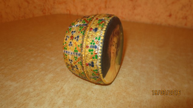 Была обычная картонная коробочка.Решила её обыграть.Можно назвать это бумажным печворком:нарвала бумажек из глянцевого журнала,наклеила их,когда высохли,потёрла ацетоном.Получилась такая красота.Долго думала,что ещё на ней сделать.решила приклеить картинку из рисовой бумаги ,выделить точками и приклеить наклейки.Другая шкатулка получилась из баночки от крема.Во!