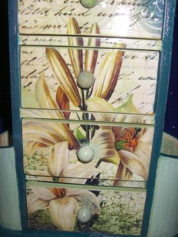 Вчера вмдела МК делали панно точно с такими же лилиями(как на бирюзовом комодике) Объёмный декупаж — очень красиво! А комодик — просто прелесть!)