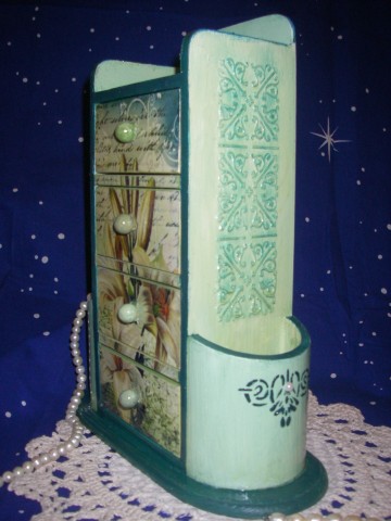 Елена, очень понравился зелененький комодик! И заготовка интересная и сделали Вы его просто отлично. На белом мне как-то мешает медальон, вернее крупные бусинки вокруг, те фото, где медальон не видно нравятся мне больше.