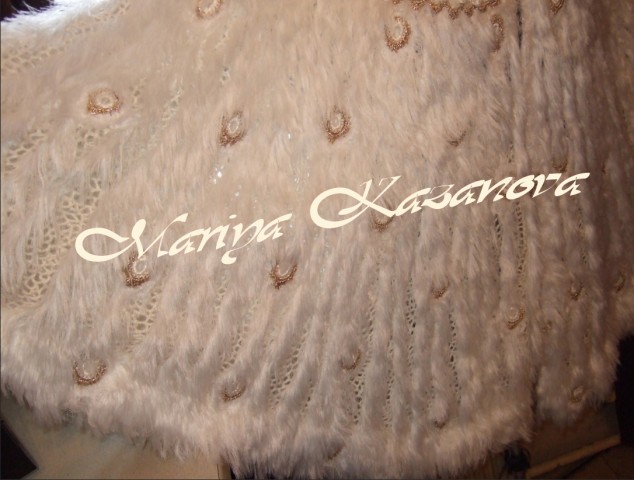 Основа накидки связана нерегулярной сеткой из пряжи" Ярн арт" мохер.Пёрышки павлина связаны из белой травки "Танго" и "Лебяжьего пуха".Кокетка ажурная из белой итальянской пряжи расшита золотом и жемчугом.Очень красивые три крючка в виде бантиков со стразами. Надеюсь что Вам понравится.Фото журнала Мод.Фотомодель Ксения Митюрич.С уважением Мария Казанова.