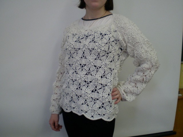 Рукава меня смущают. Если придерживаться рисунка из кружочков, трудно подогнать рисунок под сужение или расширение на рукаве. Рисунок вы сохранили, поэтому и рукава такие широкие.
