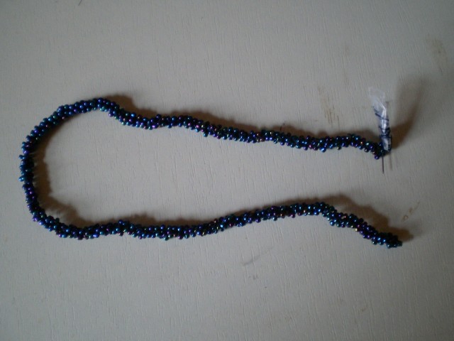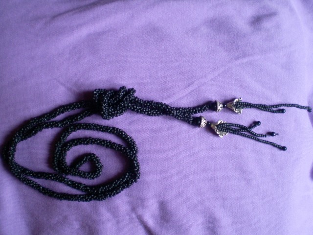 Сначала я вязала бисер в цепочку крючком, но это так долгоооо. Нашла в магазине готовые веревочки, стоят в зависимости от бисера от 8 до 25 р. за метр.