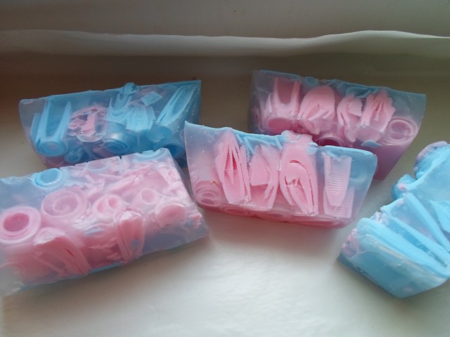То же касается и тонких полос в мыле. Если делать радужное мыло, надо предыдущий слой хорошо остужать в морозилке, нацарапывать, брызгать спиртом и заливать следующий слой, потом опять замораживать, царапать, брызгать спиртом и заливать новый слой. Так можно сделать мыло из любых цветных слоев. Таким же способом делается мыло мармелад. На пластиковый лоток, льют мыло разными слоями, потом заворачивают рулетиком, из рулетика делают сердечко, укладывают в форму и заливают прозрачной основой с блестками. Ну вот так примерно.