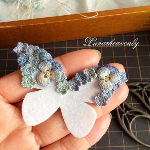 Незабудки, анютины глазки, бабочки… От таких работ поднимается настроение, приходит вдохновение и настроение становится самое весеннее! Нежные пастельные тона, которые так гармонично переходят друг в друга, ажурные, ювелирные детали, цветочные сюжеты — все это так гармонично связано между собой. Чтобы добиться естественного перехода тонов, мастер окрашивает пряжу вручную.