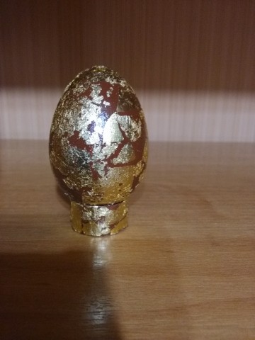 Привет Всем. Курочка Ряба снесла мне к Пасхе яичко. А яичко не простое, а золотое. На самом деле - золотое. Деревянная основа покрашена коричневой акриловой краской, а сверху яйцо покрыто сусальным золотом. Вот такое богатство.