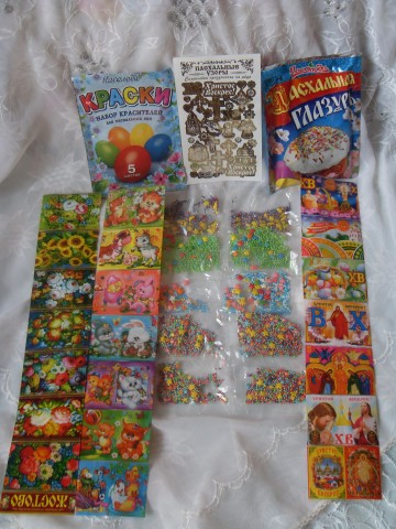 А дальше Ирочка позаботилась о том, чтобы мой праздник был красивым. Смотрите - краска для яиц, наклейки, термоплёнка, пасхальная глазурь, присыпка.