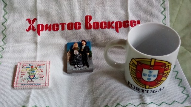 Один с парой в национальных костюмах региона ,где живёт Виктория,который называется Минью ( север Португалии).