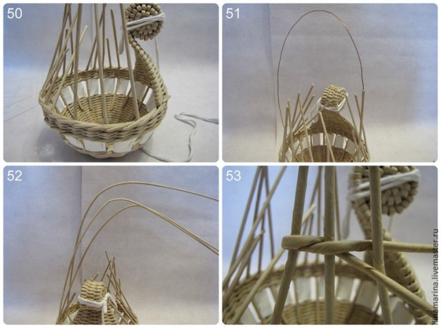 51. Отрезаем проволоку на всю длину ручки. Вставляем в стойки. (Можно использовать рыболовную леску для ручки, тогда ручка будет как бы пружинить, всегда держать нужную форму и не мяться. Так я делала в другой курочке :)