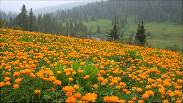 Алтай, жарки… Когда-то давно, в молодости, когда занималась туризмом, несколько лет подряд ходила по горам Алтая, Это совершенно фантастический край! И видела эти моря жарков! Огонь, разлившийся по земле!