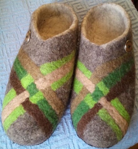 Сваляла еще одни тапочки из кавказской шерстки, эта оказалась немного другого качества, много ости, тапочки получились мохнатыми, свалялось все быстро , наличие ланолина играет свою роль, тапочки для мужчины в возрасте, в целом получилось неплохо.
