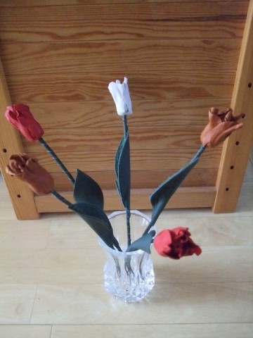 Роскошные тюльпанчики, из тонкой итальянской кожи сразу же заняли своё место в вазочке, как-будто эта вазочка только их и ждала:)