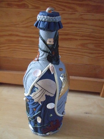 А вот и ещё одно произведение искусства (повторяюсь, но не смогла подобрать более подходящего слова) - просто шикарная, невероятно аккуратно сделанная золотыми Ирочкиными ручками и очень восхитившая моего мужа (про себя я уже молчу - в полном "отпаде" и белой зависти нахожусь:) кожаная бутылочка с морскими обитателями, весьма искусно вырезанными и раскрашенными, настоящими ракушками и янтарной крошкой.