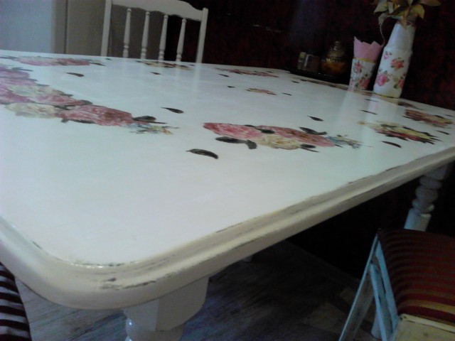 Извините-не знаю как обратиться по имени-а ник у вас сложный.Розы на белом фоне красиво смотрятся.Согласна с девочками-на фоне не хватает цветового дополнения.Середина столешницы у стола тоже смотрится пустоватой. И судя по потертостям-у вас признаки состаривания.А сверху -блеск.Уместно было использовать матовый или полуматовый лак.И розочки ярковаты-можно было слегка приглушить-для такого стиля.А вообщем и целом мне тоже нравится-беленько и чистенько.Да и работа такая -глобальная. Жаль нет фото до переделки мебели.
