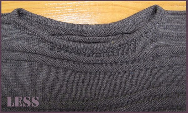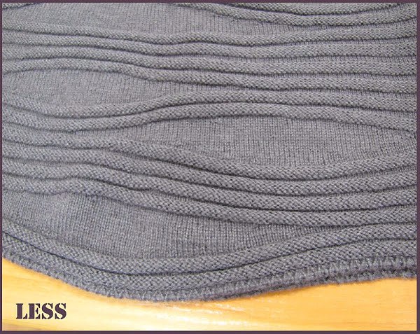 Я набрала 140 петель (в процессе вязания делала убавки-прибавки по краям вязания, чтобы лучше ложилось по фигуре), провязала после итальянского набора (в три нити, а все осн. полотно вязалось в две) 4 ряда лиц, 4 ряда изн., 4 ряда лиц, 4 изн., - дальше - 2 ряда лицевой вязкой, 3 ряд - провязала петель 80, накид, в этом и весь секрет от дырок при повороте, повернули вязание на изн. сторону, провязали петель 15, опять накид. Повернули на лиц. сторону, провязали уже 20 петель, когда провязываем то место, где у нас накид, надо провязать его вместе со следующей в ряду петлей так, чтобы он спрятался за лицевой петлей. Тогда спереди у нас будет гладкое полотно лицевой вязкой, а переход рядов будет незаметным и все будет гладко. В общем, провязали 20 петель, накид, повернули на изн., провязали 25 петель, расправляясь с накидом таким же способом, только с изн. стороны. Так вяжем рядов 12-14. До конца ряда не доходим! Это у нас получился нижний изгиб. Теперь надо исполнить верхний изгиб: раньше мы свои ряды удлиняли, теперь будем их укорачивать: следующий ряд вяжем короче, чем предыдущий - то есть, не доходим до места с накидом петель на 5 -7 (по желанию), накид, поворачиваем полотно, опять не доходим до накида, например, на 7 петель, накид, поворачиваем, так делаем до тех пор, пока на спице между накидами не останется петель 10, провязываем ряд до конца (лучше подгадать так, чтобы это были лицевые петли) потом изнаночный ряд, в котором провязываем все накиды и заканчиваем волну. У нас есть волна! Дальше вяжем гармошку из 4 левых и 4 изнаночных рядов, а потом таким же образом делаем волну в другом месте. Путем изменения количества петель, на какое удлиняем/укорачиваем ряд мы добьемся любой кривизны своих волн. Главное - если у нас разное количество петель, то это будет, напр., 10-8-8-8-6-5-4, и ни в коем случае не 7-10-5--8 и т. д., иначе будут заломы. Да! посмотрите, пож., на фото разложеного свитера: в верхней части у нас появятся волны, которые доходят до края полотна - там надо будет доходить до конца ряда, то есть, одна сторона вязания будет временно длиннее, чем вторая. Но мы все это компенсируем потом в следующей волне - она будет выходить навылет в противоположной стороне вязания.