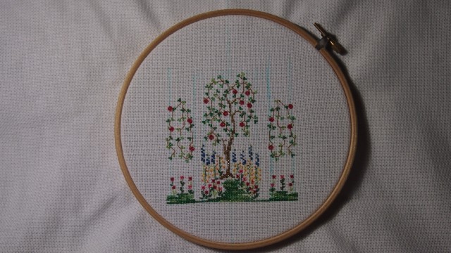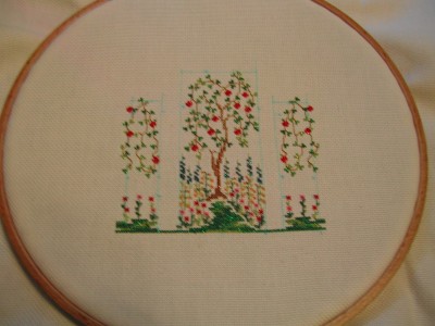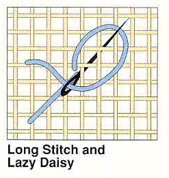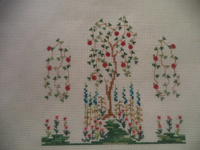 Веточки,стебельки, контур ствола деревца вышиваем в 1 нить мулине стежками бэкстич. Листочки на цветах вышиваем стежками LAZY DAISY мулине в 1 ниточку,а цветочки (1 нить мулине +1 нить крейника).