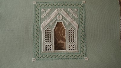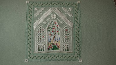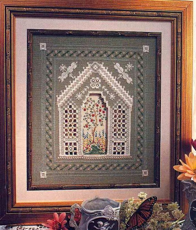 Если оформляете картину" рамка в рамке " как на верхнем фото(фото автора), то отмеряете от вышитой рамки 12см с четырех сторон сюда входят все прибавки.Все определились, теперь со знанием дела, отрезаете лишнюю ткань. Вторую ткань(подложку) берете уже по размеру первой и на ней вышиваете сад, соответственно совместив центры первой и второй тканей.Аккуратно разглаживаете ткань рукой, еще раз проверяете центры по вертикали и горизонтали, можно подколоть булавочками и маркером делаете метки двери, я делала метки не по внешней стороне двери, а отступя во внутрь на ширину блоков, обрамляющие дверь.