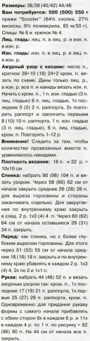Женский пуловер связан спицами №6 и крючком №4 из 500/500/550 г пряжи (64% хлопка, 27% вискозы, 9% полиакрила, 85 м/50 г).