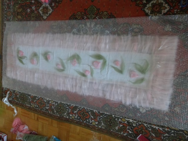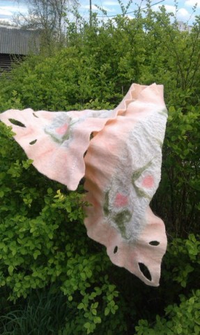 Вообще, для тех кто ни разу не валял, рекомендую начинать с подобных изделий. Расход шерсти не большой, кол-во цветов 2-3 для первого опыта достаточно и вискозки конечно в тон не повредит. По трудозатратам валяется быстро. Надо только долго шерстку раскладывать -равномерно-единственная сложность для новичков. Ну как говорится "глаза бояться а руки делают"