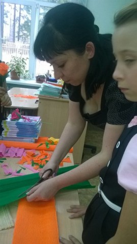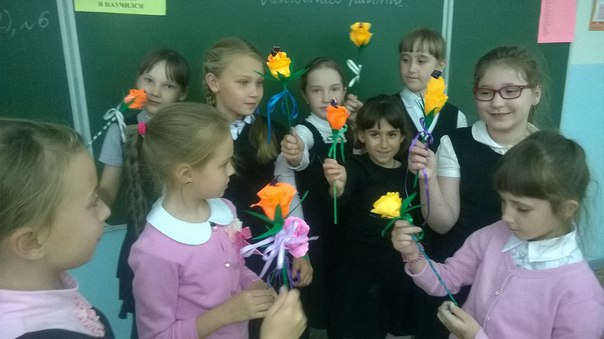 Здравствуйте, дорогие рукодельницы))) Сегодня хотела показать вам свои фото , как я в школе проводила мастер-классы))) Началось всё с того, что учительница моей дочки попросила показать, как делать розу с конфетой из гофры, тут подбежали одноклассницы и начали тоже просить)) В итоге, на следующий день, я пришла в школу с бумагой. конфетами и всякой всячиной для рукоделия)) Фото конечно мало, но девочки с большим интересом мастерили розу