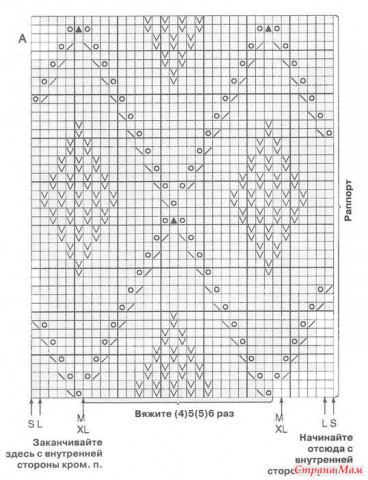 Спинка: наберите на спицы № 3 103(113)123(135) п., вяжите 4 ряда изн. петлями (1-й ряд - лиц. сторона). Далее вяжите узор, следуя схеме А. При длине работы 5(6)7(8) см закройте по 1 п. по краям с внутренней стороны кром. петель. Для этого вяжите 2 лиц. п. вместе, прокручивая их, в конце ряда вяжите 2 лиц. п. вместе. Продолжайте закрывать петли в каждом 12-м ряду еще 2 раза. На высоте 16(17)18(19) см наберите дополнительно по 1 п. по краям с внутренних сторон кром. петель. Продолжайте набирать петли в каждом 10-м ряду еще 5 раз. Вяжите доп. петлями рисунок. Если петель недостаточно для создания узора, вяжите этими петлями лиц.