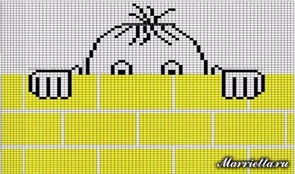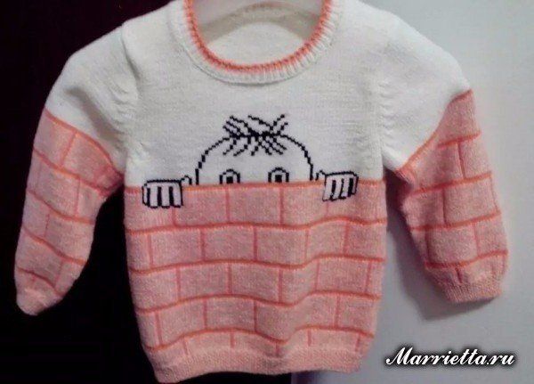 На высоте 10 (11) 13 см поменяйте нить на белую, провяжите 1 ряд (лицевой) лиц. петлями, следующий изн. ряд провяжите изн. петлями, следующий лиц. ряд провяжите лиц. петлями и след. изн. ряд провяжите изн. петлями, при этом в первом размере прибавьте 1 петлю, а во 2-м и 3-м размерах – убавьте 1 петлю = 125 (131) 139 петель. Далее вяжите лиц. гладью, вывязывая рисунок по схеме, начиная от стрелки в соответствии с размером и повторяя 4 петли раппорта необходимое количество раз. При этом крайние 8 петель планки с обеих сторон продолжайте вязать белой нитью резинкой 2 х 2. Провяжите с 1 – 6-й ряды схемы, при этом в 6-м ряду в 3-м размере убавьте 1 петлю = 125 (131) 138 петель. Далее вяжите 7-й ряд рисунка, начиная от стрелки в соответствии с размером: провяжите петли перед раппортом, затем повторите 13 петель раппорта 9 (9) 10 раз, в конце вяжите 4 (7) 4 петли после раппорта. Провяжите 7 – 15-й ряды схемы. Далее вяжите белой нитью 2 ряда лиц. гладью, следующий лиц. ряд провяжите изн. петлями. На высоте верхней части 17 (19) 20 см разделите работу на 3 части так, чтобы на каждую полочку пришлось по 37 (39) 40 петель, а на спинку – средние 67 (69) 74 петель. Далее каждую часть вяжите отдельно.